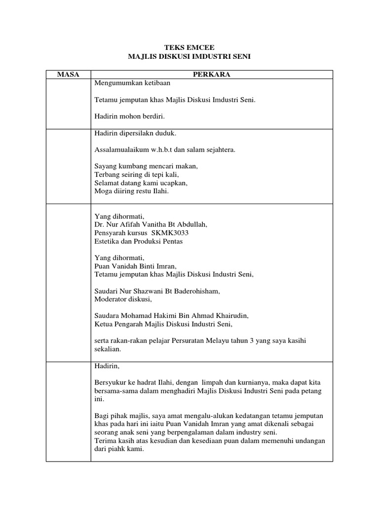 ISU KESELAMATAN DALAM HUBUNGAN MALAYSIA INDONESIA SEJAK 1980ANpdf. SKRIP PROGRAM Masa emcee 1020AM- 1025 AM Aturcara Pendaftaran peserta Pengumuman. View contoh TEKS EMCEEdocx from MPU 3041 at IPG Kampus Bahasa Melayu.